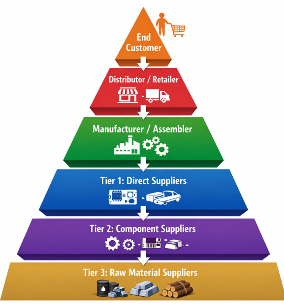 - Tier 3 suppliers: Suppliers further upstream, often providing raw materials or basic processing