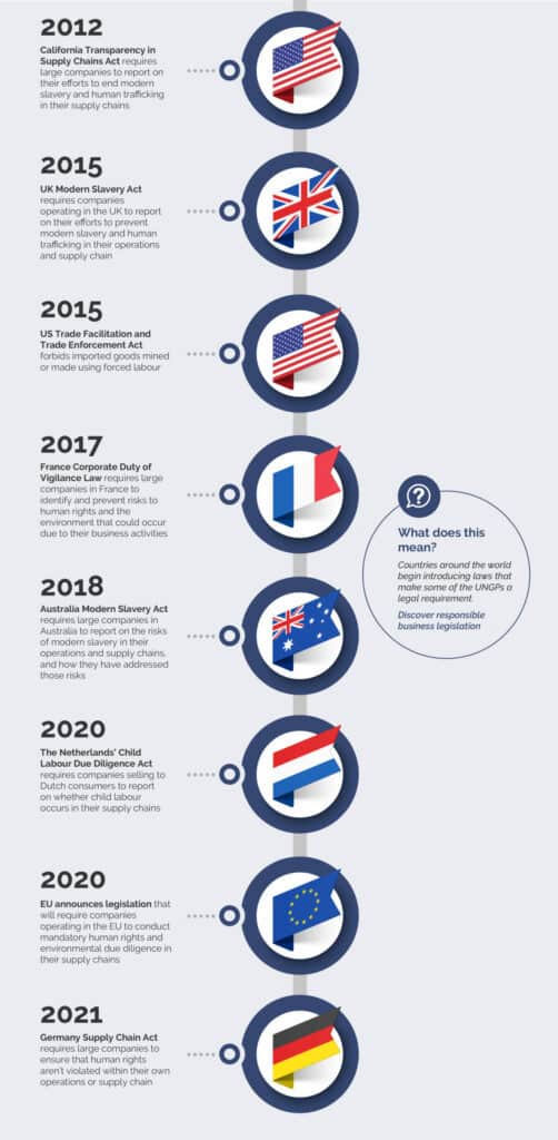 2021年、国連は、企業が責任を持って運営し、調達するためのガイドラインを導入しました。 画期的な「ビジネスと人権に関する指導原則」と、それらが過去10年間に影響を及ぼした人権デューデリジェンス法について、当社の視覚的なタイムラインをご覧ください。