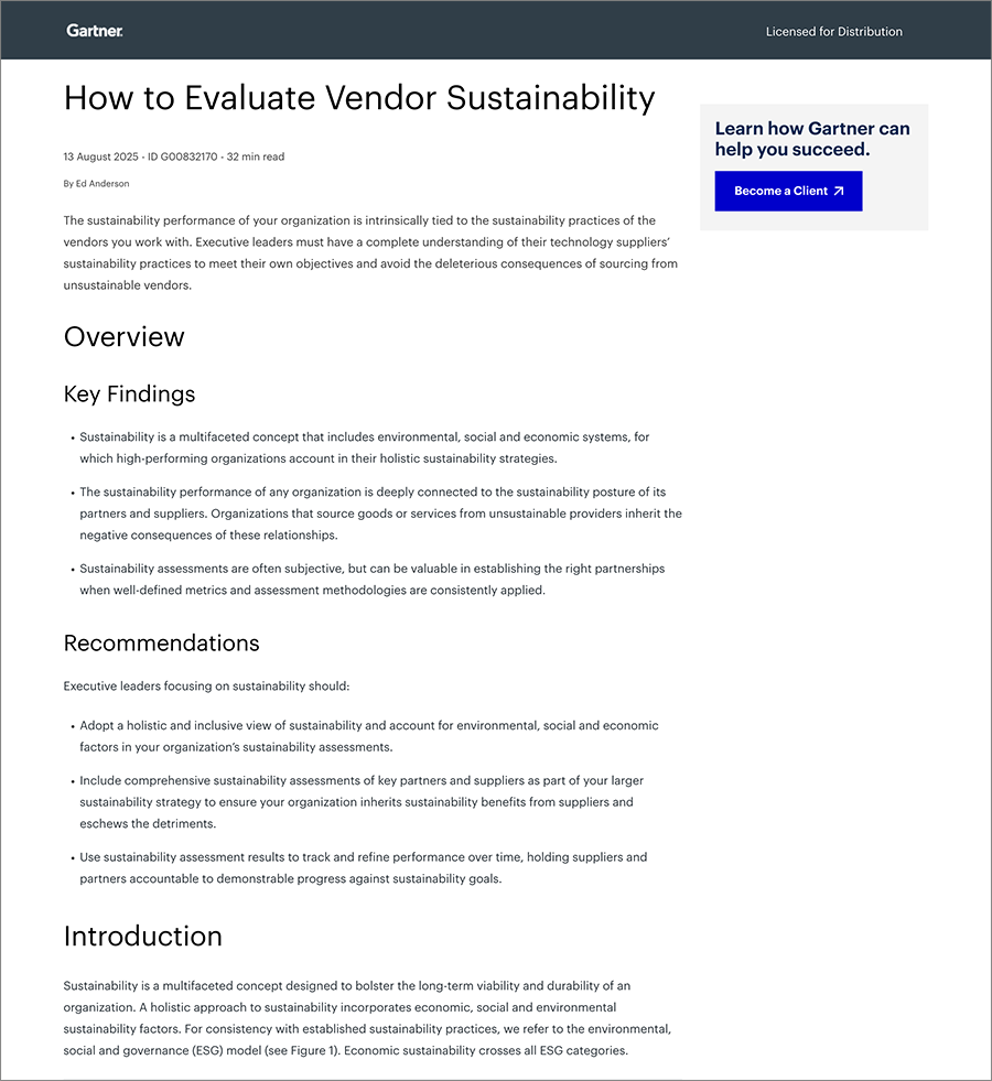 Gartner, How to Evaluate Vendor Sustainability, 13 August 2025, Ed Anderson. Gartner is a trademark of Gartner, Inc.,and/or its affiliates.
